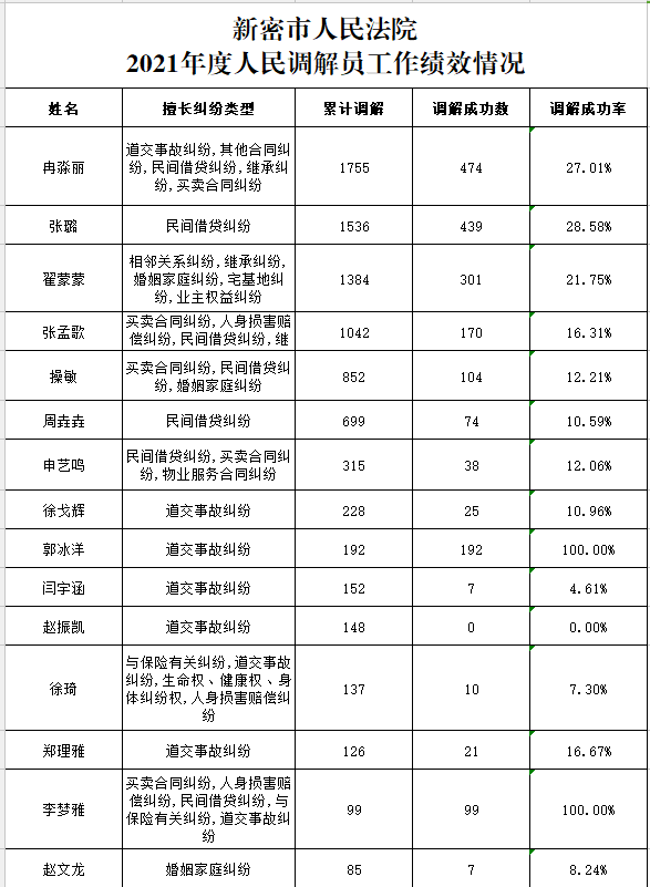 新密市人民法院2021年度人民调解员工作绩效情况